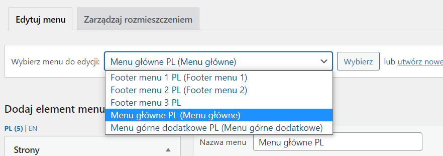 Wybierz menu, które chcesz edytować i kliknij “Wybierz“. Domyślnie jest to Menu główne.