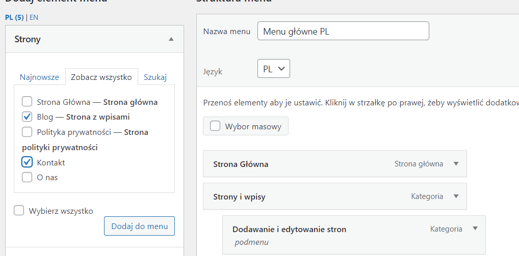 Jeśli chcesz dodać do menu podstrony, wybierz je z listy po lewej stronie i kliknij “Dodaj do menu“