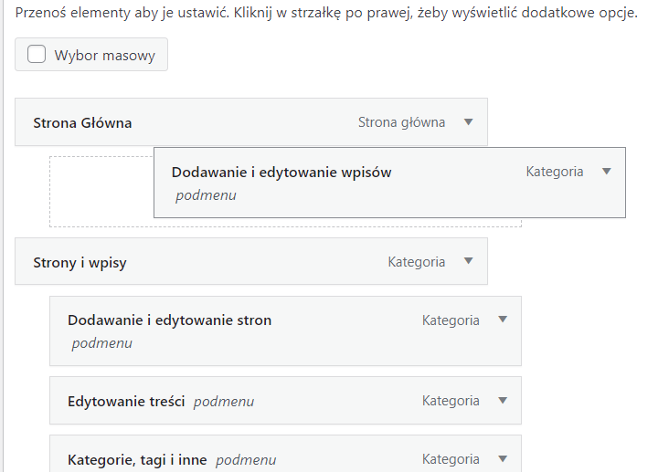 Następnie możesz zarządzać kolejnością w menu. Wystarczy przytrzymać lewym przyciskiem myszy daną pozycję i przesunąć ją w wybrane miejsce.
