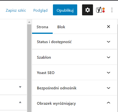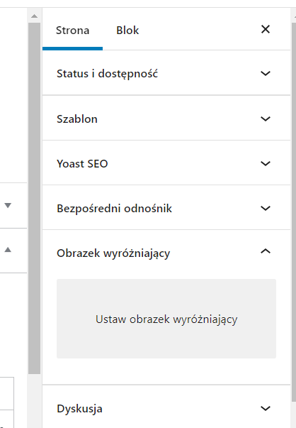 W pasku po prawej stronie wybierz “Obrazek wyróżniający“. Jest to zdjęcie, które będzie reprezentować daną stronę. Możesz wybrać obrazek z już istniejących na stronie bądź dodać nowy.