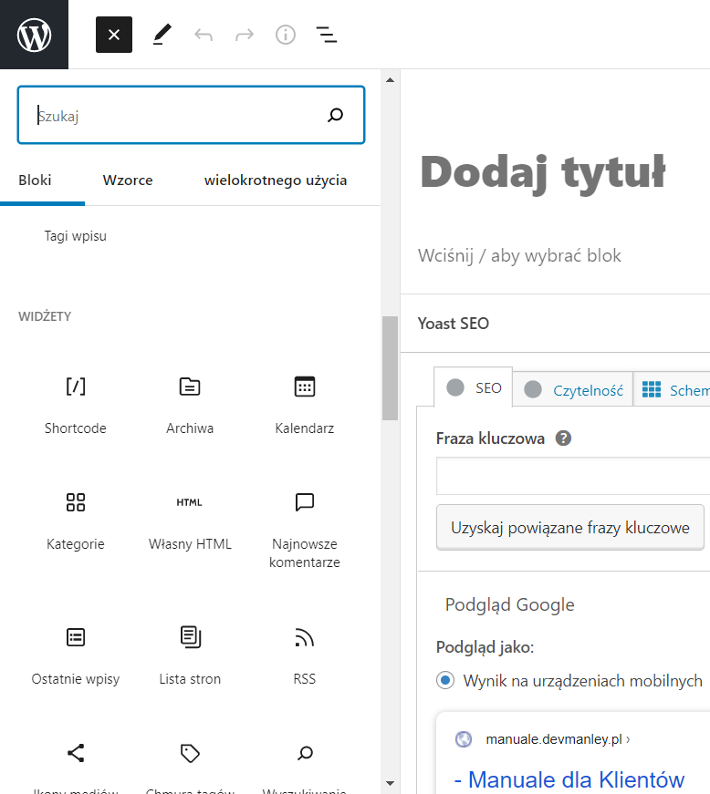 Można również dodać blok klikając na czarny znak plusa w polu edycji: