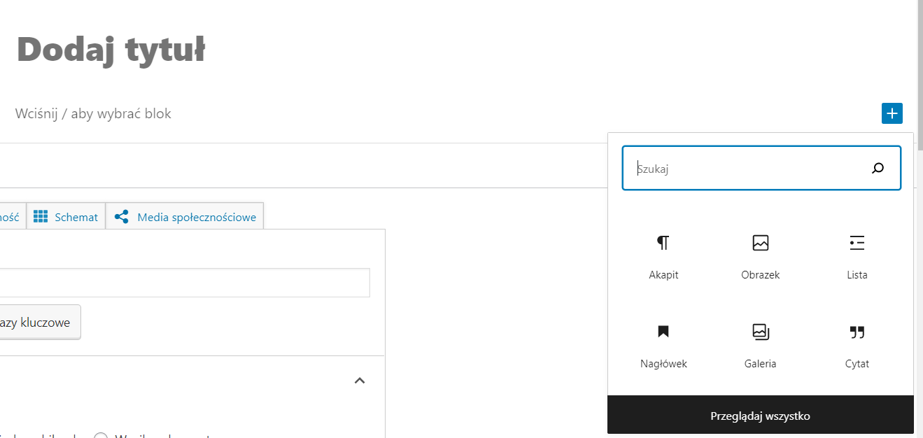 Po naciśnięciu znaku plusa możemy przeglądać typy bloków i wybrać ten, którego szukamy. Dostępnych jest wiele bloków, np.: