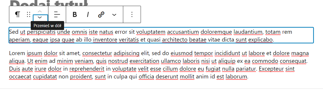 W podstawowych ustawieniach bloku mamy możliwość zarządzania jego pozycją. Możemy go przenieść lub przesunąć do góry/do dołu.