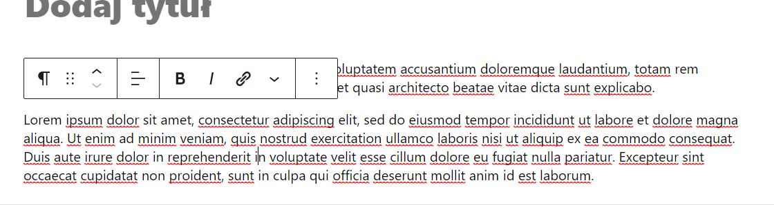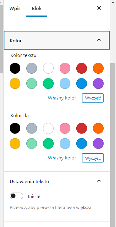 Każdy blok, który dodamy ma możliwość edycji jego styli. Takie ustawienia znajdziemy w pasku nad blokiem, który edytujemy lub na pasku bocznym. Warto dodać, że ustawienia są różne dla różnych bloków, np. dla Paragrafu można zmienić kolor tekstu/tła, a dla obrazka można zmienić jego położenie lub styl.