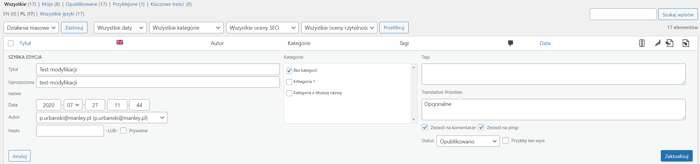 Przejdź do listy artykułów. Następnie najedź myszką na artykuł do którego chcesz przypisać kategorię, a następnie kliknij “Szybka edycja“.