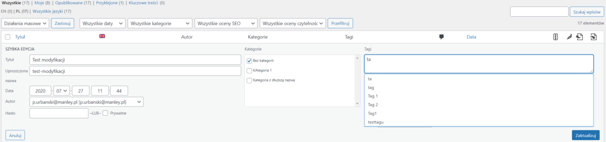 Tagi wpisujemy i możemy wybrać je z listy podpowiedzi. Możemy również wypisać tagi po przecinku. Na końcu kliknij “Zaktualizuj“.