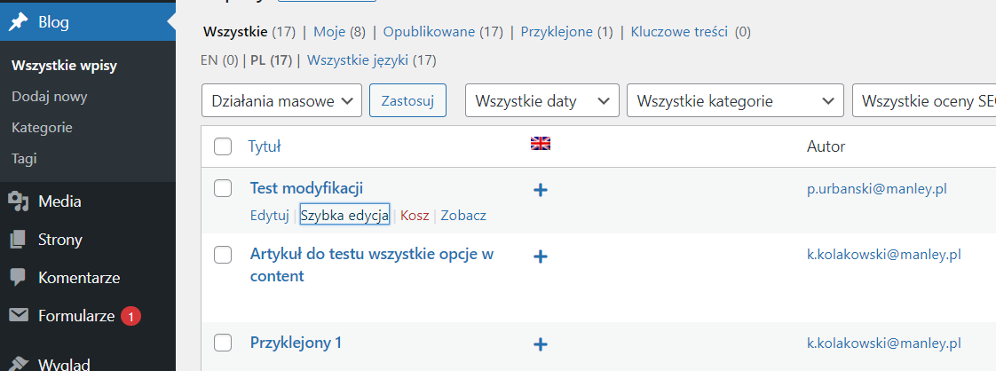 Przejdź do listy artykułów lub listy stron. Następnie najedź myszką na artykuł/stronę dla której chcesz zmienić autora dodania, a następnie kliknij “Szybka edycja“.